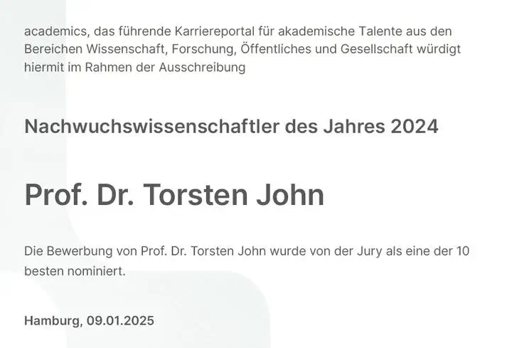 Torsten John has been recognised among the Top 10 Young Scientists in Germany in the academics.de Nachwuchspreis 2024. The award highlights young researchers across all disciplines for their independent scientific contributions.